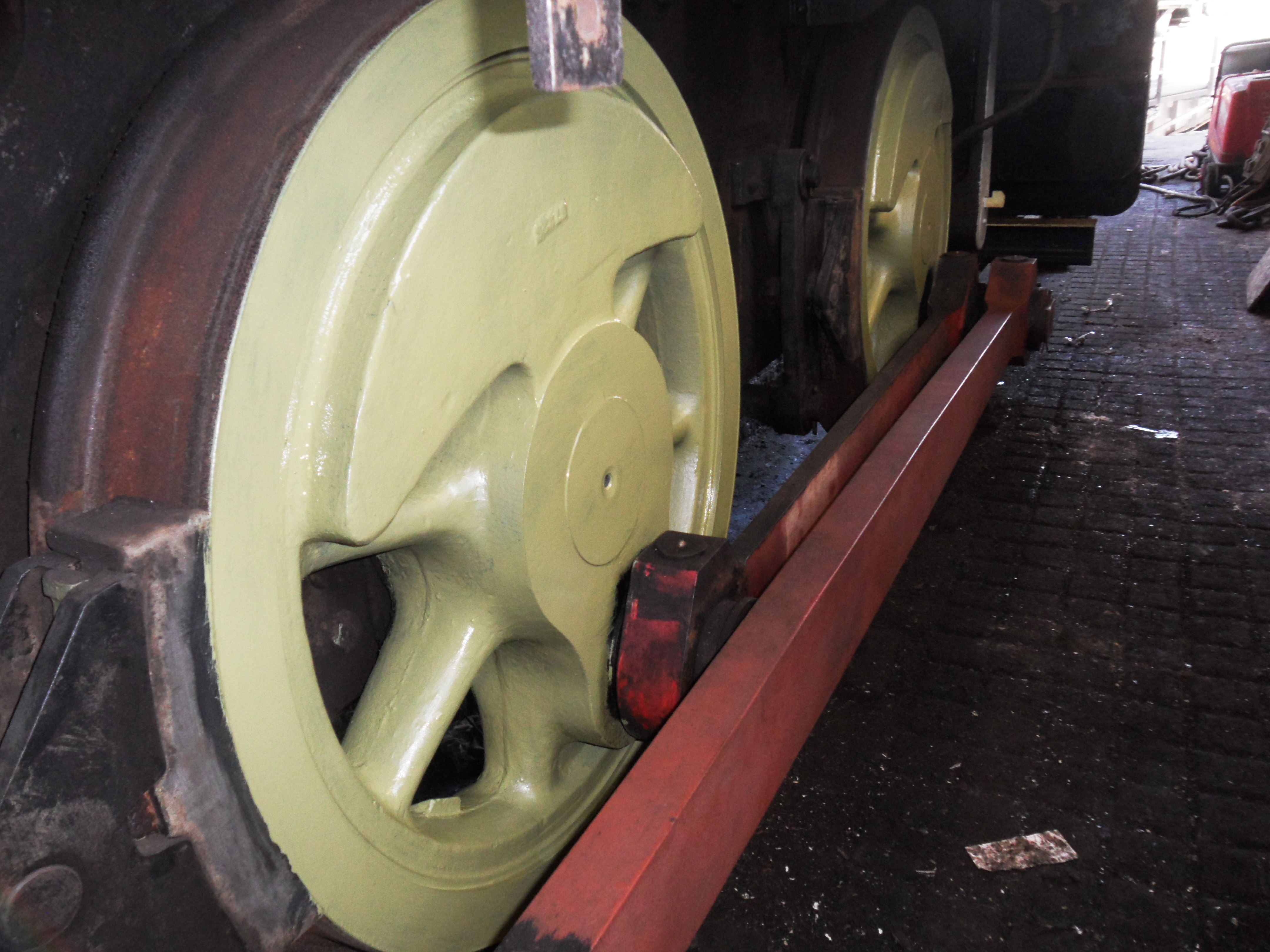 Steam gala weekend, so much of the Sygnets' working day spent watching the trains go by... :-) Â However still plenty of time to make good progress, with a number of miscellaneous items cleaned up and into primer off the loco, plus a "freshen up" of the left-hand wheels (which had had some protective primer applied in 2010; this time around the underlying gunge has been removed first!) Â The rear end of the airbrake cylinder was successfully removed, with the cover cleaned up and into primer, the piston removed, cleaned, and the cylinder greased up (all in remarkably good condition) and partially re-assembled. Reassembly will now have to wait some weeks or months for completion, however, as on Monday May was shunted out of the loco shed and into the goods shed. Â This new environment is warmer (marginally) and drier than the loco shed, being fully enclosed, and with platforms each side provides more convenient access to the upper body and engine bay. Â It does of course mean we can't reach anything much below the running plate, however! |