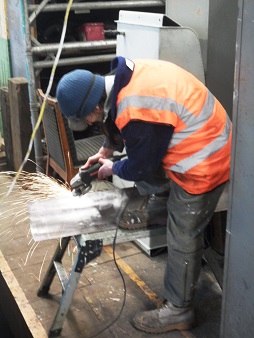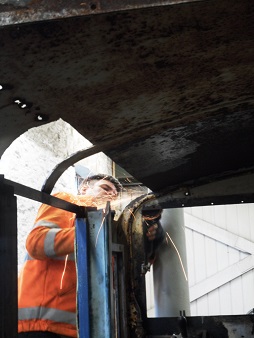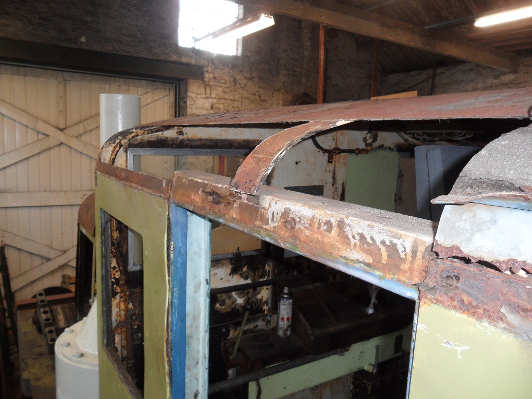 Many thanks to Rob who came to the Goods Shed for a while on Saturday and has made an excellent start on the work to the cab roof. Getting easier access to the roof was the main reason we needed to be in shed, so it's great to see good progress in just an afternoon. Rob's made a start on cutting  out the rotted lower sections of the cab roof, ready for the replacement sections - already available and rolled to the the right curve - to be welded into place. The photos show May's new "sun roof". Other work completed since the last Sygnets' meeting include getting the cab and main bonnet handrails, Ferricon'd at the last meeting, into primer; spot-filling some of the worst rust pock-marks on the cab side; cutting the smaller of two holes in the rearmost bonnet cover, for the fuel dip-stick; removing some of the screws from the cab instrument panel; and of course removing doors and windows in readiness for the cab roof work. |