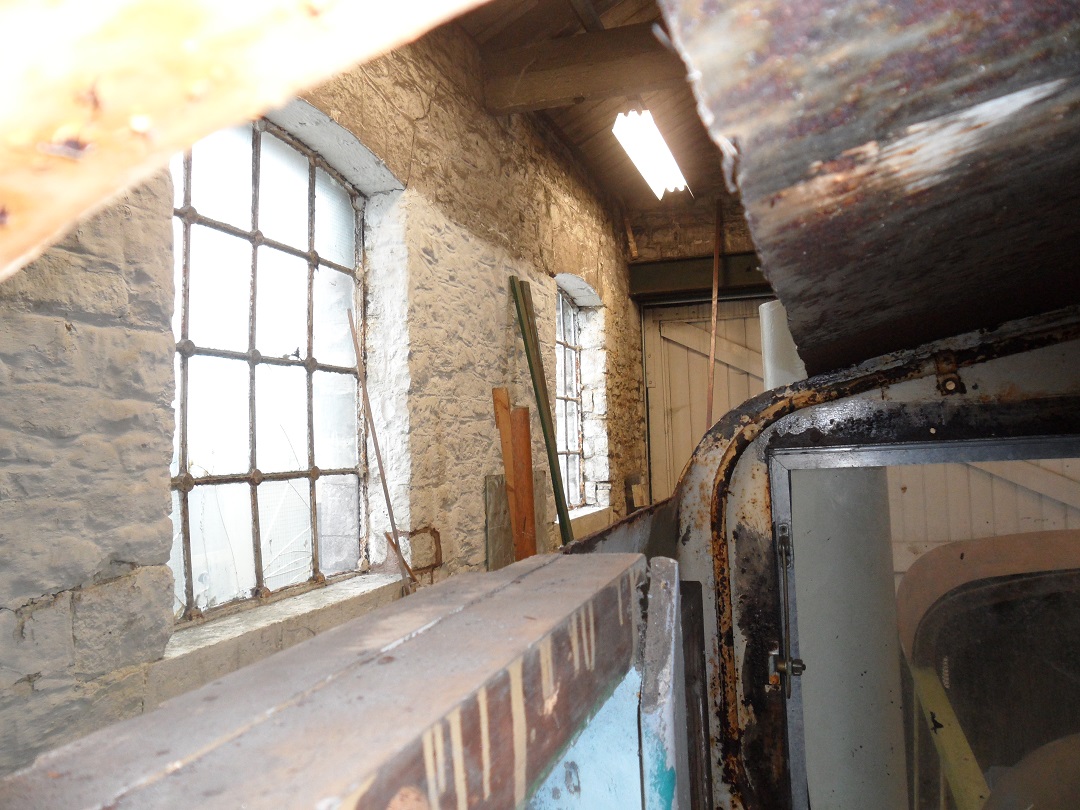 Many thanks to all those Sygnets working on "May" this weekend (lots in the morning, lots more in the afternoon). Our first working day in the goods shed, we now enjoy a truly weather-proofed (rain-proofed, anyway) environment plus the luxury of platforms both sides.The morning saw all the dismantled components previously stored in the cab being offloaded onto shelving right next to the loco; this not only completely freed up the cab (allowing us to resume work on the cab interior and remaining fittings) but also allowing us to organise the components and find things much more easily. Other jobs completed ranged from undercoating the whole exhaust + chimney, rubbing down and Ferricon'ing the handrails, clearing rust and gunk off the front of the footplate, right through to scraping off years of grime from the one remaining original cab window, plus a coat of primer on the inside of some of the bonnet framing. Finally, the seven bonnet side covers were retrieved from storage further up the line, and the two "new-build" covers made some years ago were put into undercoat, the others having been done a long time ago. |