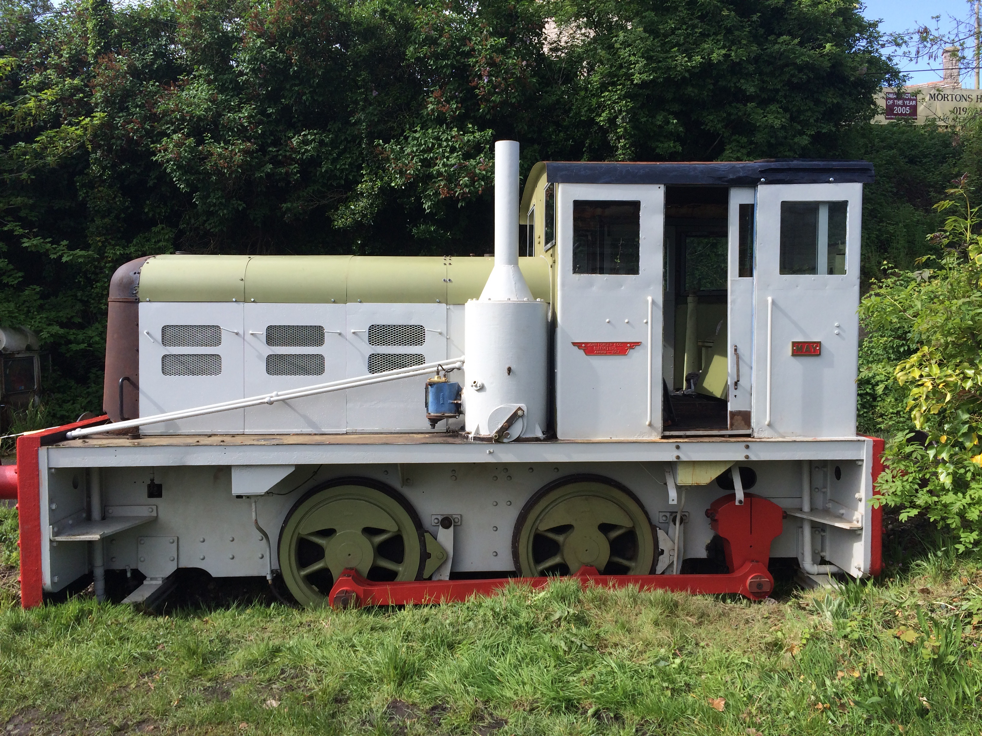 Swanage Diesel Gala weekend, and "May" has been moved up the line to Corfe Castle. Located at the end of the old goods shed road, this move involved a bit of "bulldozing" through overgrowth but she's on display there, and over the weekend we had many visitors. As you'll see from the pictures, all four bonnet top panels are bolted on (albeit with some adjustments needed) and even over the weekend further work continued, with the left-hand wheels now into grey undercoat. The cab windows have been temporarily refitted to give some weather-proofing whilst out in the open again. Thanks to all the Sygnets who have worked so hard to get May to this stage, in which she received many kind words and compliments. On the Tuesday prior to diesel gala, a convoy of vehicles including both "May" and the prototype HST power car 41001 were moved up from Swanage to Corfe.  What a privilege to be coupled to a celebrity engine like that; bet the Project Miller guys never expected that!  :-) |